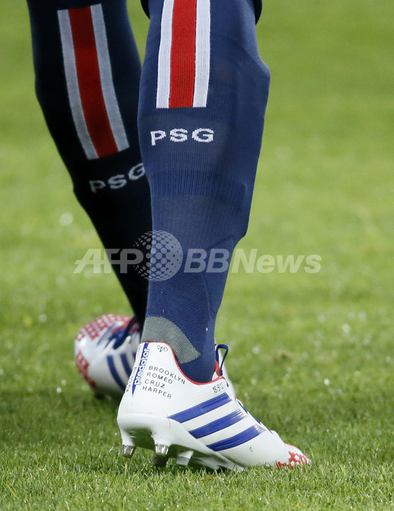4人の子供の名前が書かれたPSGのデビッド・ベッカムのスパイク(2013年5月18日撮影)。(c)AFP/KENZO TRIBOUILLARD