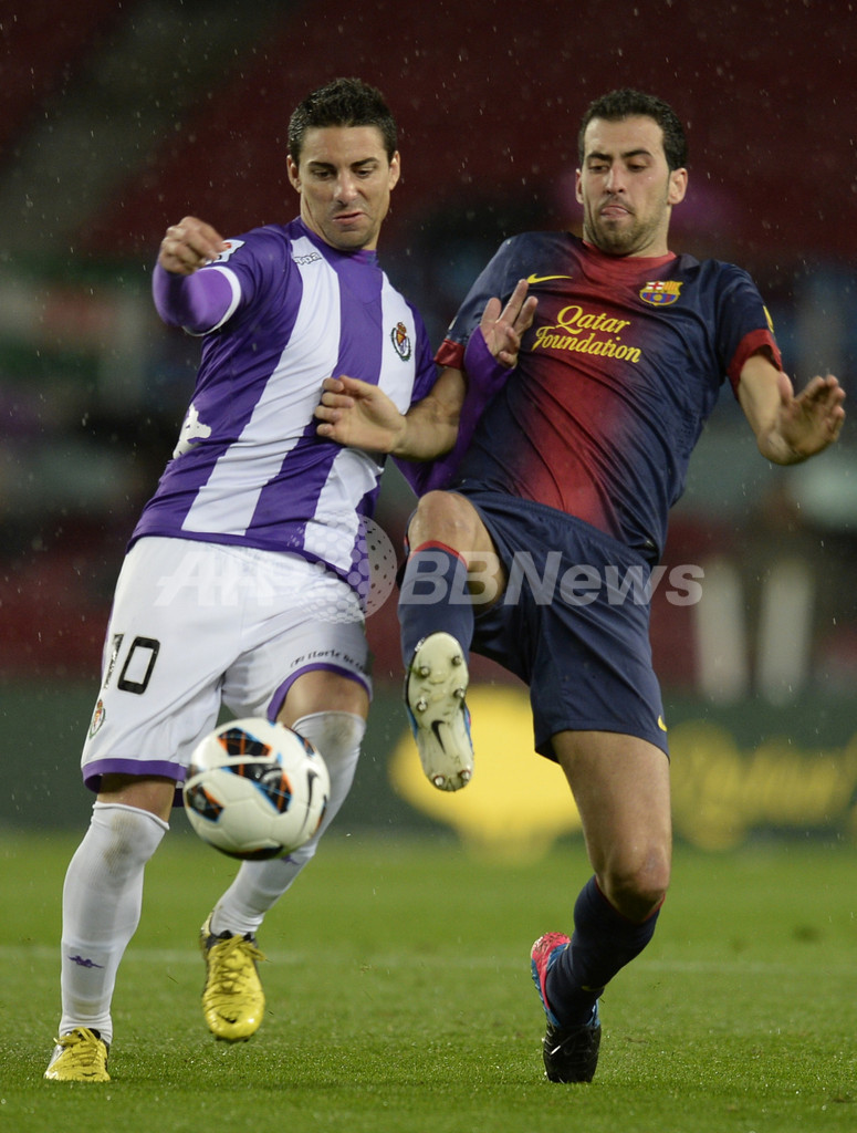 レアル・バジャドリードのオスカル・ゴンサレス(Oscar Javier Gonzalez Marcos、左)とボールを競るFCバルセロナのセルヒオ・ブスケッツ(Sergio Busquets、2013年5月19日撮影)。(c)AFP/LLUIS GENE