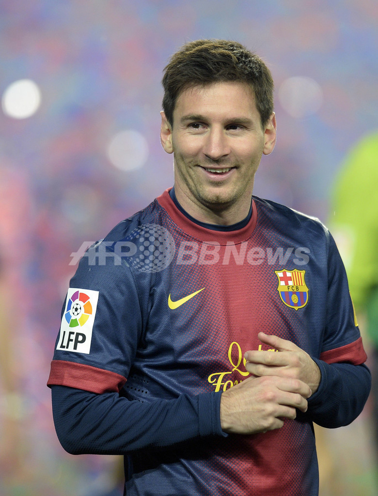 試合後の優勝セレモニーで笑顔を見せるFCバルセロナのリオネル・メッシ(Lionel Messi、2013年5月19日撮影)。(c)AFP/LLUIS GENE