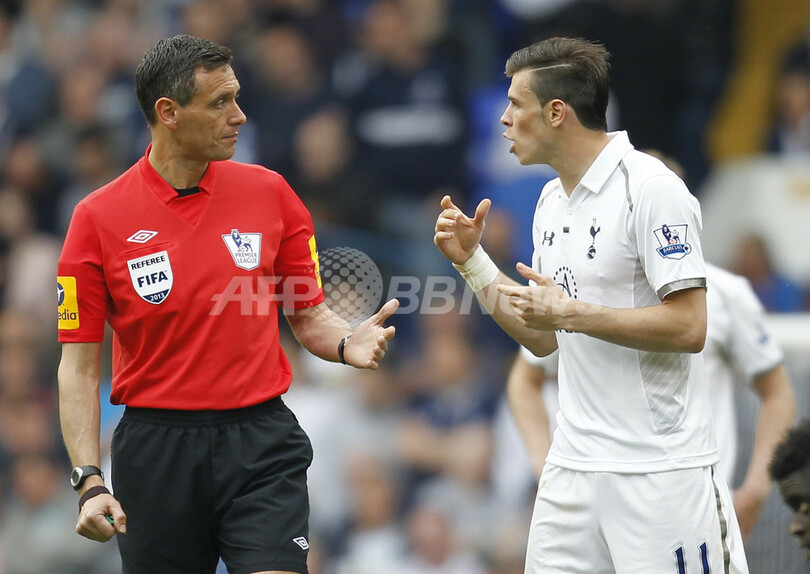 アンドレ・マリナー(Andre Marriner)主審(左)と言葉を交わすトッテナム・ホットスパーのギャレス・ベイル(Gareth Bale、2013年5月19日撮影)。(c)AFP/IAN KINGTON