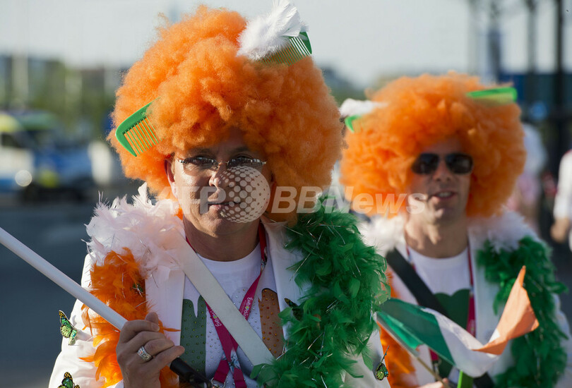 写真は、決勝会場の外で開場を待つアイルランドのファン(2013年5月18日撮影)。(c)AFP/JOHN MACDOUGALL