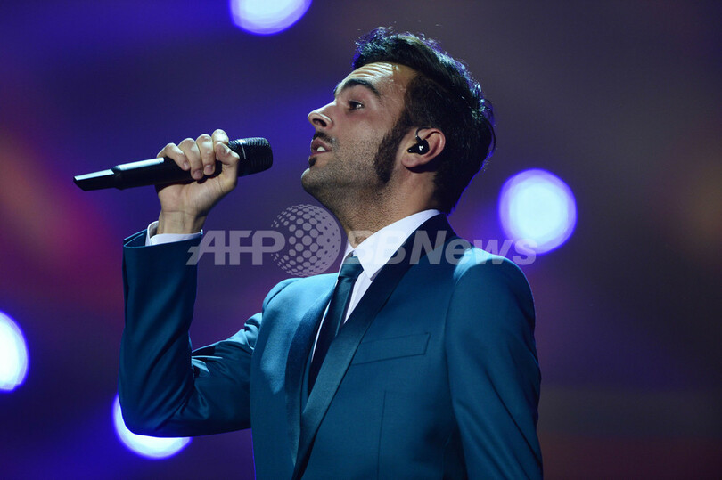 写真は、決勝でパフォーマンスを披露するイタリア代表のマルコ・メンゴーニ(Marco Mengoni)さん(2013年5月18日撮影)。(c)AFP/JOHN MACDOUGALL