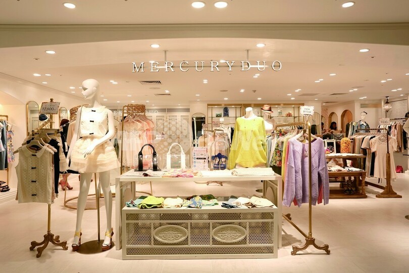 「リッチエレガンス-sweet cool girl-」をコンセプトに、品良くトレンドをミックスさせている「マーキュリーデュオ」。夏のシーズンテーマ、「Relax Pallet~Modern Feminin~」に合わせて、春の花からリーフへとモチーフを変化させながら、ビビッドな色づかいで都会的なリゾート服がお目見え。