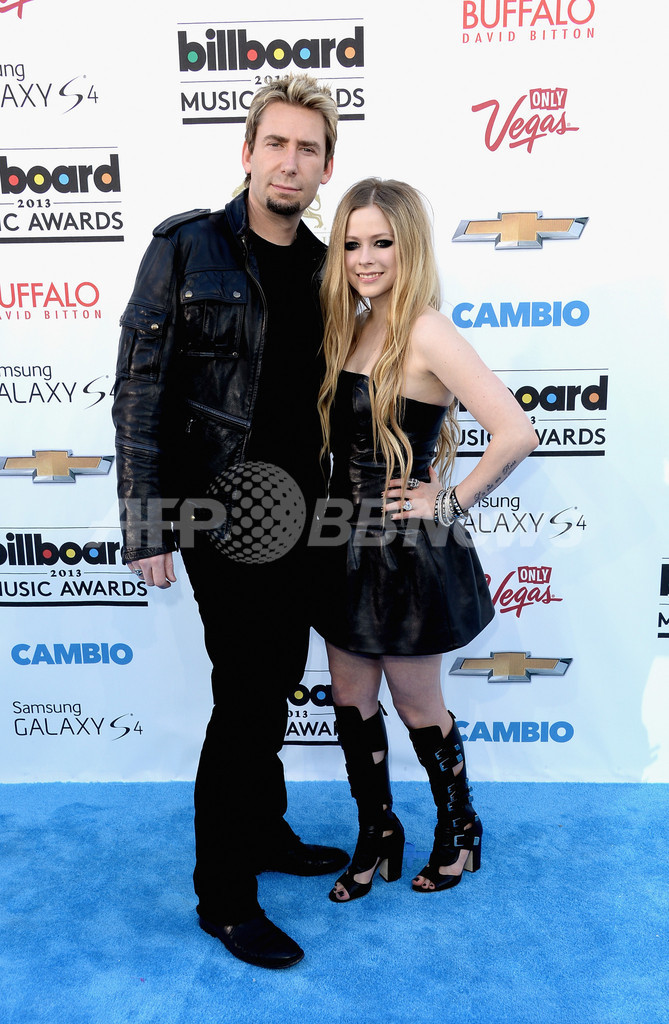 写真は、会場に到着したアヴリル・ラヴィーン(Avril Lavigne)とニッケルバック(Nickleback)のチャド・クルーガー(Chad Kroeger、2013年5月19日撮影)。(c)AFP/Getty Images/Jason Merritt