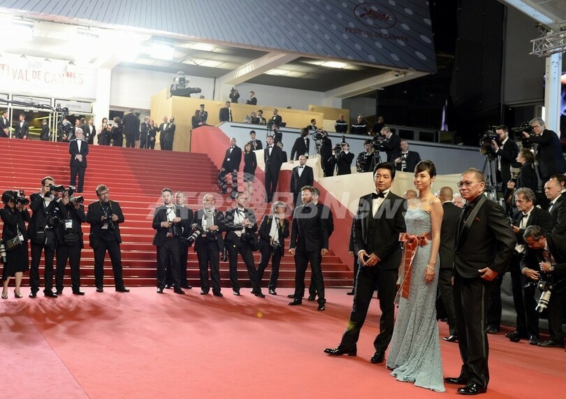 【5月21日 AFP】南仏カンヌ(Cannes)で開催中の第66回カンヌ国際映画祭(Cannes Film Festival)で20日、コンペティション部門に出品されている三池崇史(Takashi Miike)監督作『藁の楯』の公式上映が行われ、監督とともに主演の大沢たかお(Takao Osawa)、共演者の松嶋菜々子(Nanako Matsushima)がレッドカーペットを歩いた。この日は、公式上映に先立ち、記者会見とフォトコールも行われた。(c)AFP