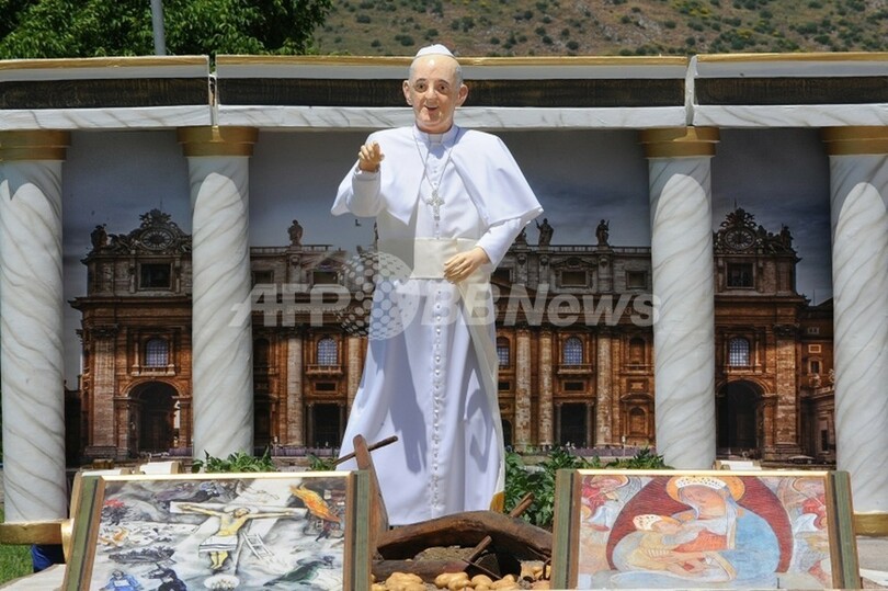 写真は、ジャガイモ畑に立つフランシス法王の像(2013年5月20日撮影)。(c)AFP/MARIO LAPORTA