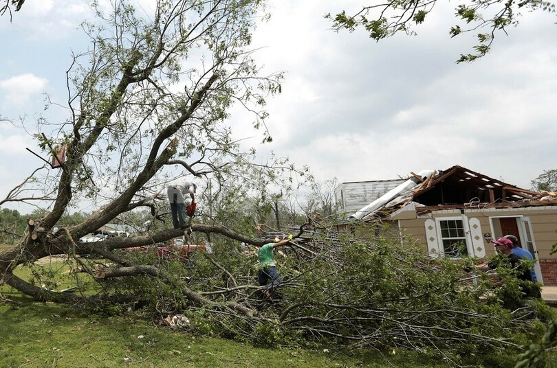 写真はオクラホマ州ショーニー近郊で、竜巻で倒れた樹木をチェーンソーで切断するボランティア(2013年5月20日撮影)。(c)AFP/Getty Images/Brett Deering