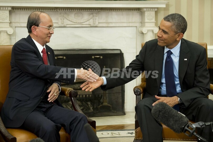 2011年に名目上は文民として大統領に就任し一連の改革に着手したテイン・セイン大統領は、オバマ大統領との会談を通じて、何十年も続いた軍事政権を経てミャンマーは確実に変化しつつあるというメッセージを改めて発信した。(c)AFP
