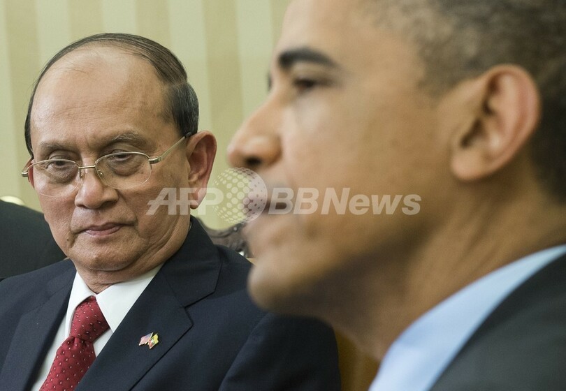 2011年に名目上は文民として大統領に就任し一連の改革に着手したテイン・セイン大統領は、オバマ大統領との会談を通じて、何十年も続いた軍事政権を経てミャンマーは確実に変化しつつあるというメッセージを改めて発信した。(c)AFP
