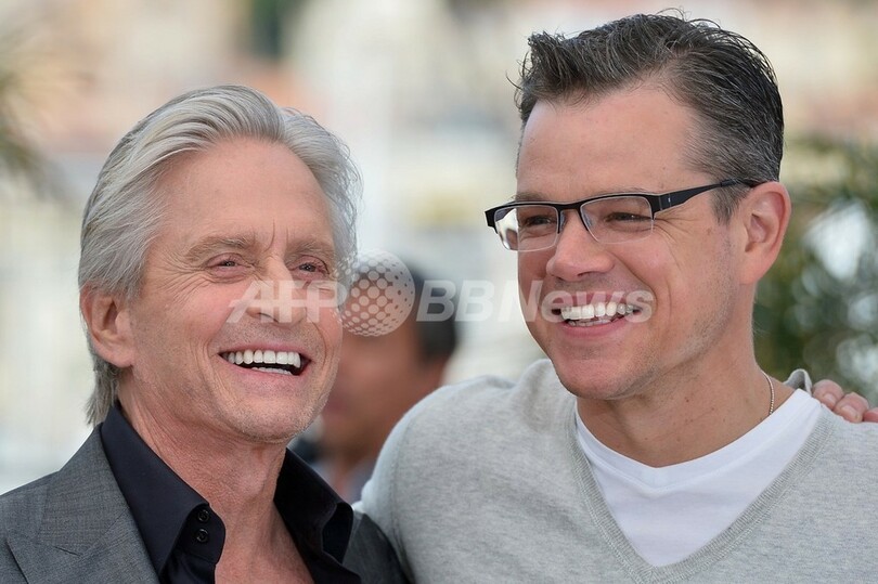 写真は、フォトコールに登場したダグラスとデイモン(2013年5月21日撮影)。(c)AFP/Richard INGHAM/ALBERTO PIZZOLI