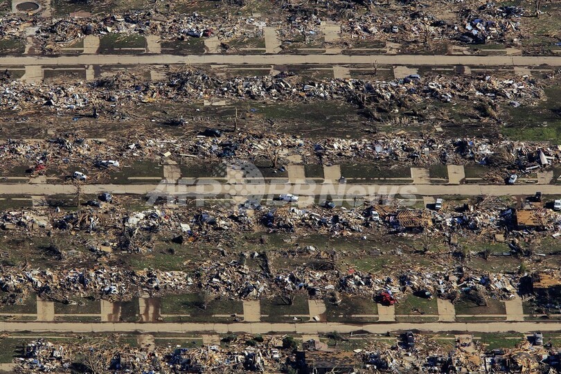 【5月22日 AFP】米中部オクラホマ(Oklahoma)州オクラホマシティー(Oklahoma City)郊外で20日に発生した巨大な竜巻で、壊滅的な被害を受けたムーア(Moore)では、現在も生存者の捜索が続けられている。死者は少なくとも24人。同州ノーマン(Norman)にある米海洋大気庁(NOAA)暴風雨研究所(Severe Storms Laboratory)によると、竜巻の強さは最も強い「EF5」で、風速は89メートルを超えた。(c)AFP