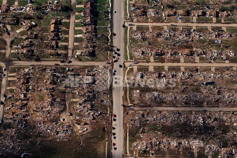 【5月22日 AFP】米中部オクラホマ(Oklahoma)州オクラホマシティー(Oklahoma City)郊外で20日に発生した巨大な竜巻で、壊滅的な被害を受けたムーア(Moore)では、現在も生存者の捜索が続けられている。死者は少なくとも24人。同州ノーマン(Norman)にある米海洋大気庁(NOAA)暴風雨研究所(Severe Storms Laboratory)によると、竜巻の強さは最も強い「EF5」で、風速は89メートルを超えた。(c)AFP