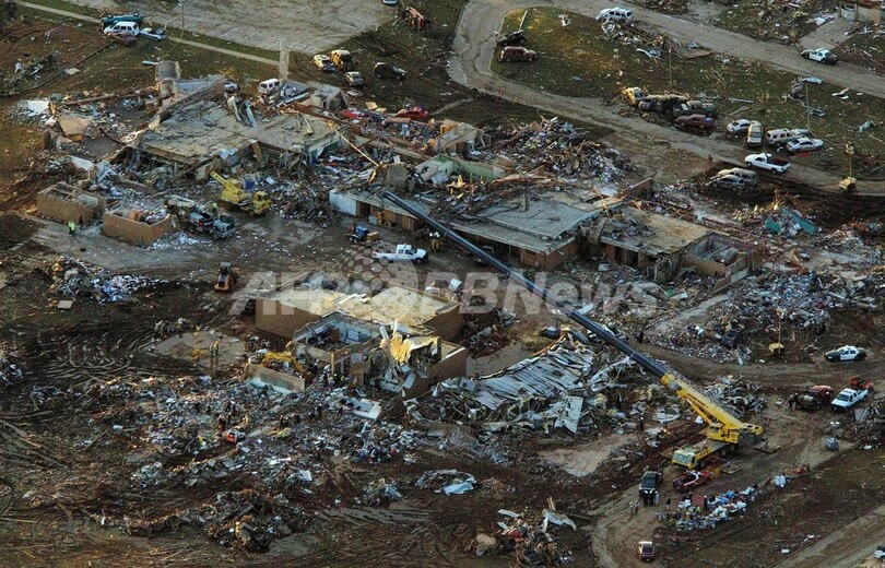 【5月22日 AFP】米中部オクラホマ(Oklahoma)州オクラホマシティー(Oklahoma City)郊外で20日に発生した巨大な竜巻で、壊滅的な被害を受けたムーア(Moore)では、現在も生存者の捜索が続けられている。死者は少なくとも24人。同州ノーマン(Norman)にある米海洋大気庁(NOAA)暴風雨研究所(Severe Storms Laboratory)によると、竜巻の強さは最も強い「EF5」で、風速は89メートルを超えた。(c)AFP
