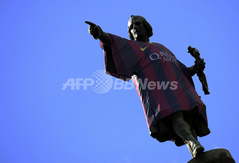 FCバルセロナのユニフォームを着るクリストファー・コロンブス像(2013年5月22日撮影)。(c)AFP/LLUIS GENE
