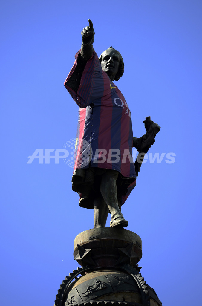 【5月23日 AFP】サッカー、スペイン1部リーグのFCバルセロナ(FC Barcelona)は21日、2013-14シーズンのユニフォームを発表し、翌日の22日にはバルセロナ(Barcelona)市内のクリストファー・コロンブス(Christopher Columbus)像に新ユニフォームが着せられた。(c)AFP