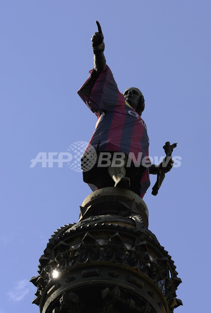 FCバルセロナのユニフォームを着るクリストファー・コロンブス像(2013年5月22日撮影)。(c)AFP/LLUIS GENE