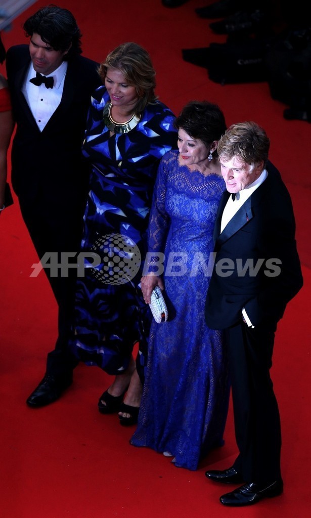 写真は、レッドカーペットに登場したレッドフォード夫妻とチャンダー監督夫妻(2013年5月22日撮影)。(c)AFP/Deborah COLE/LOIC VENANCE