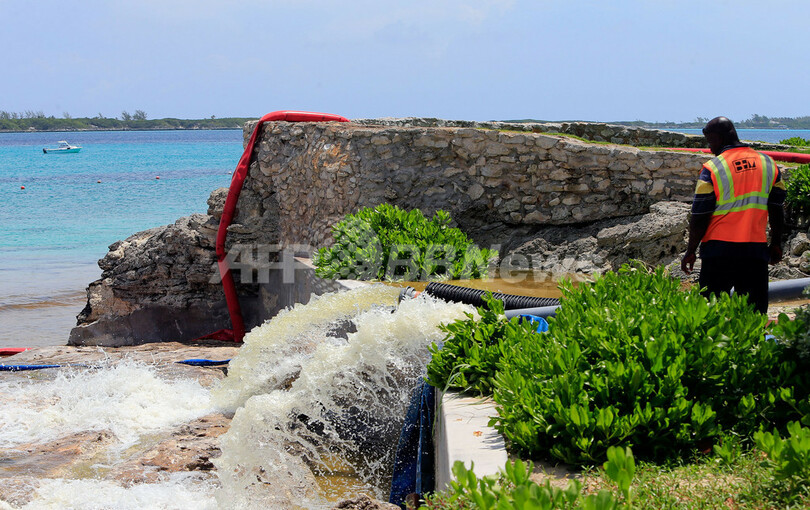 ポンプを使って17番、18番ホールの水を海に排水する担当者(2013年5月23日撮影)。(c)AFP/Getty Images/Sam Greenwood