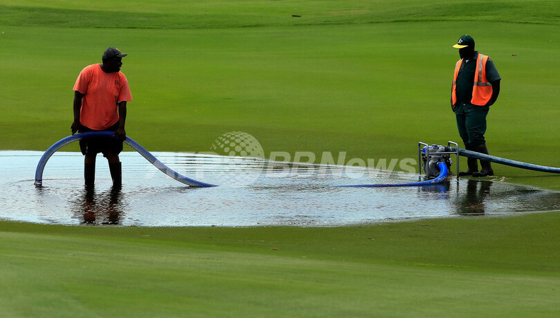 21日の豪雨でコースが浸水したため、大会は54ホールに短縮されて23日に開幕する予定だったが、開幕は24日に順延された。(c)AFP