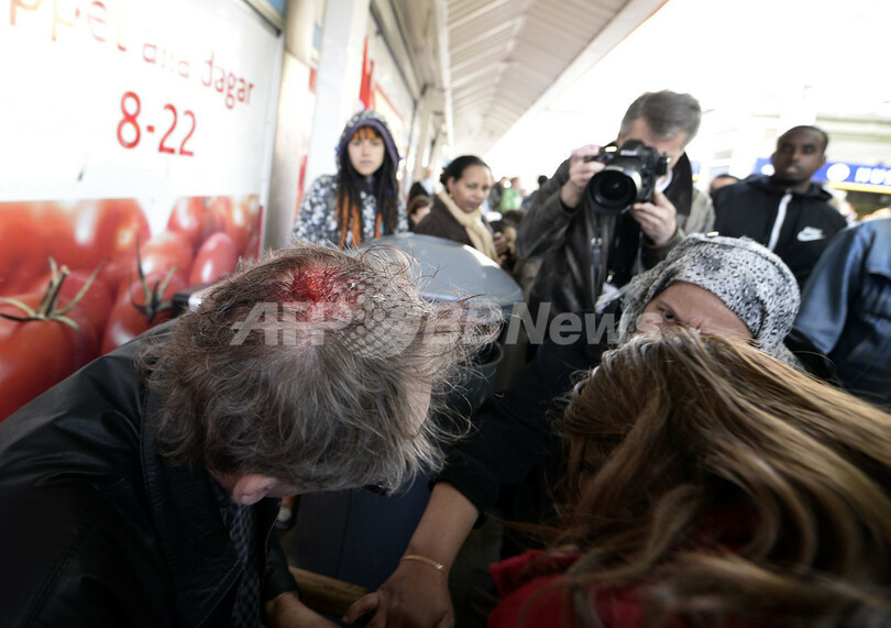 写真は、ヒュースビー地区で暴動に巻き込まれ、投石に当たって頭部を負傷した男性(手前、2013年5月22日撮影)。(c)AFP/JONATHAN NACKSTRAND