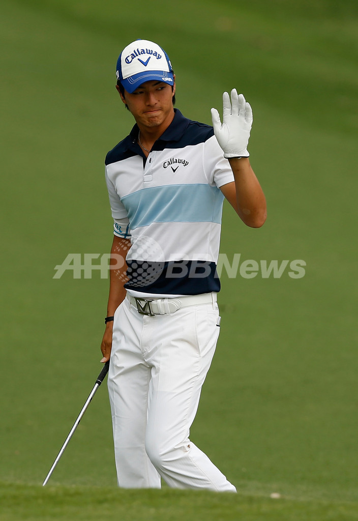 5番ホールでギャラリーに手を振る石川遼(2013年5月23日撮影)。(c)AFP/Getty Images/Scott Halleran