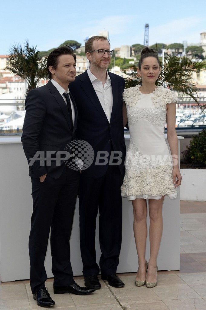 写真は、フォトコールに登場した(左から)米俳優ジェレミー・レナー(Jeremy Renner)、グレイ監督、仏女優マリオン・コティヤール(Marion Cotillard、2013年5月24日撮影)。(c)AFP/ANNE-CHRISTINE POUJOULAT