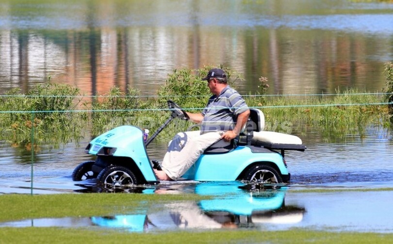 水没した9番ホールを進むカート(2013年5月24日撮影)。(c)AFP/Getty Images/Sam Greenwood