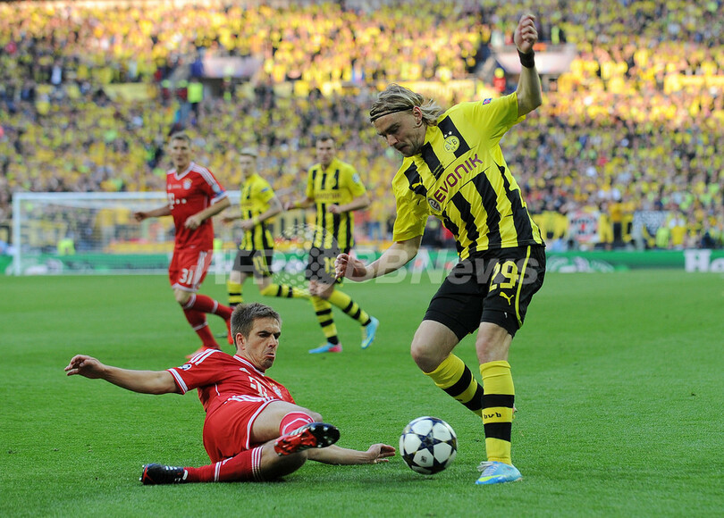 ボルシア・ドルトムントのマルセル・シュメルツァー(Marcel Schmelzer)にスライディングタックルを仕掛けるバイエルン・ミュンヘンのフィリップ・ラーム(Philipp Lahm、2013年5月25日撮影)。(c)AFP/ANDREW YATES