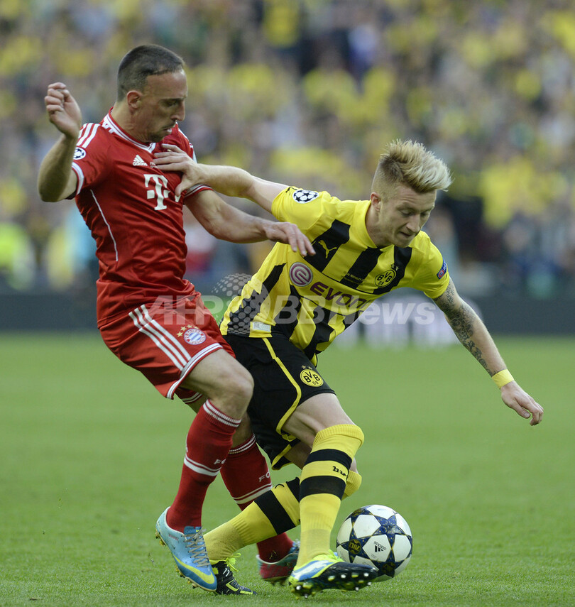 バイエルン・ミュンヘンのフランク・リベリ(Franck Ribery)とボールを競るボルシア・ドルトムントのマルコ・ロイス(Marco Reus、2013年5月25日撮影)。(c)AFP/CHRISTOF STACHE