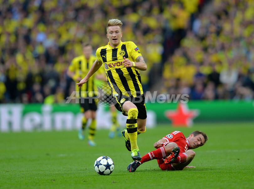 バイエルン・ミュンヘンのフィリップ・ラーム(Philipp Lahm)のスライディングタックルをかわすボルシア・ドルトムントのマルコ・ロイス(Marco Reus、2013年5月25日撮影)。(c)AFP/ANDREW YATES