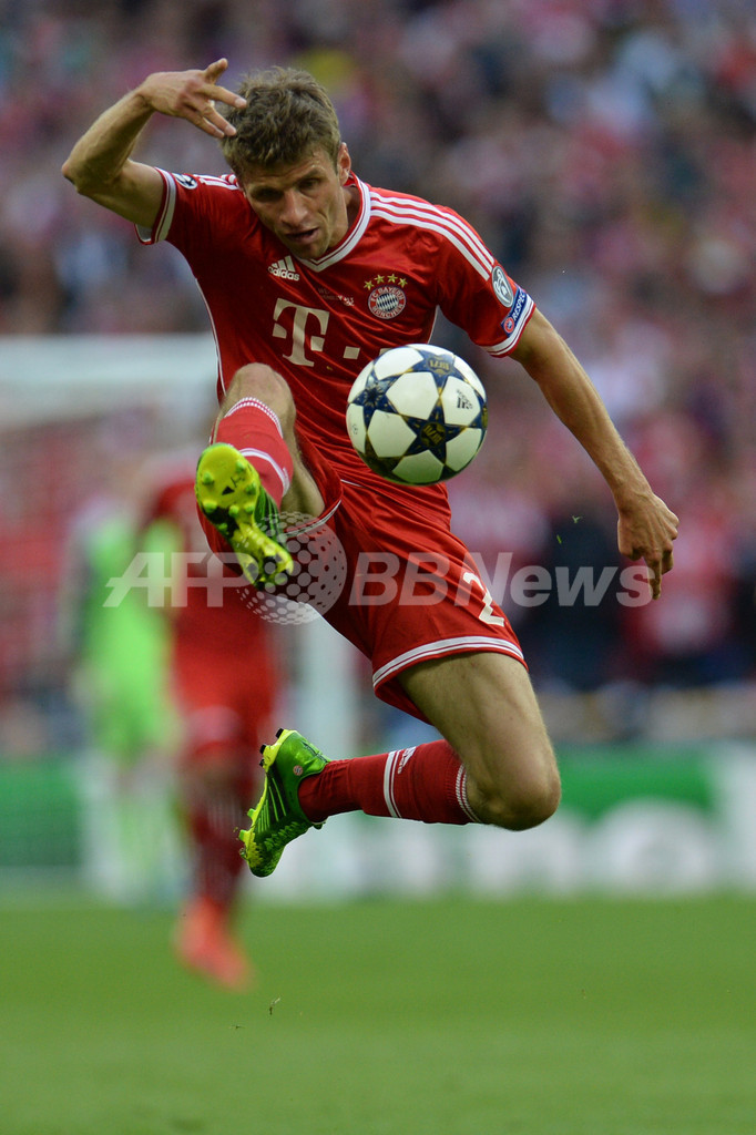 ボールをコントロールするバイエルン・ミュンヘンのトーマス・ミュラー(Thomas Muller、2013年5月25日撮影)。(c)AFP/PATRIK STOLLARZ