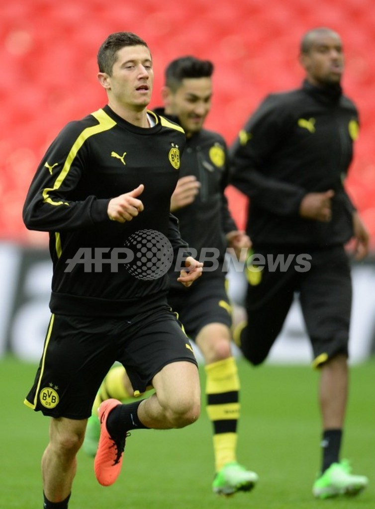 【5月25日 AFP】欧州チャンピオンズリーグ(UEFA Champions League 2012-13)の決勝を翌日に控えた24日、バイエルン・ミュンヘン(Bayern Munich)とボルシア・ドルトムント(Borussia Dortmund)がそれぞれ、英ロンドン(London)のウェンブリー・スタジアム(Wembley Stadium)で最終調整を行った。(c)AFP