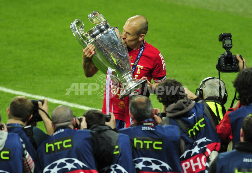 優勝トロフィーに口づけするバイエルン・ミュンヘンのアリエン・ロッベン(Arjen Robben、2013年5月25日撮影)。(c)AFP/GLYN KIRK