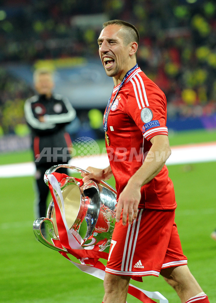 優勝トロフィーを手に歓喜するバイエルン・ミュンヘンのフランク・リベリ(Franck Ribery、2013年5月25日撮影)。(c)AFP/ANDREW YATES