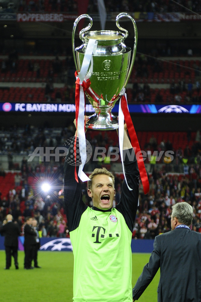 優勝トロフィーを掲げ歓喜するバイエルン・ミュンヘンのマヌエル・ノイアー(Manuel Neuer、2013年5月25日撮影)。(c)AFP/ADRIAN DENNIS