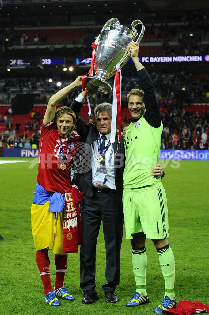 優勝トロフィーを掲げる(左から)バイエルン・ミュンヘンのアナトリ・ティモシュチュク(Anatoliy Tymoshchuk)、ユップ・ハインケス(Jupp Heynckes)監督、マヌエル・ノイアー(Manuel Neuer、2013年5月25日撮影)。(c)AFP/ADRIAN DENNIS