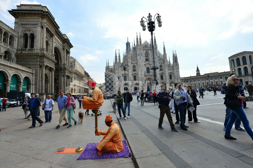 まるで空中浮遊、ミラノ大聖堂前の大道芸人