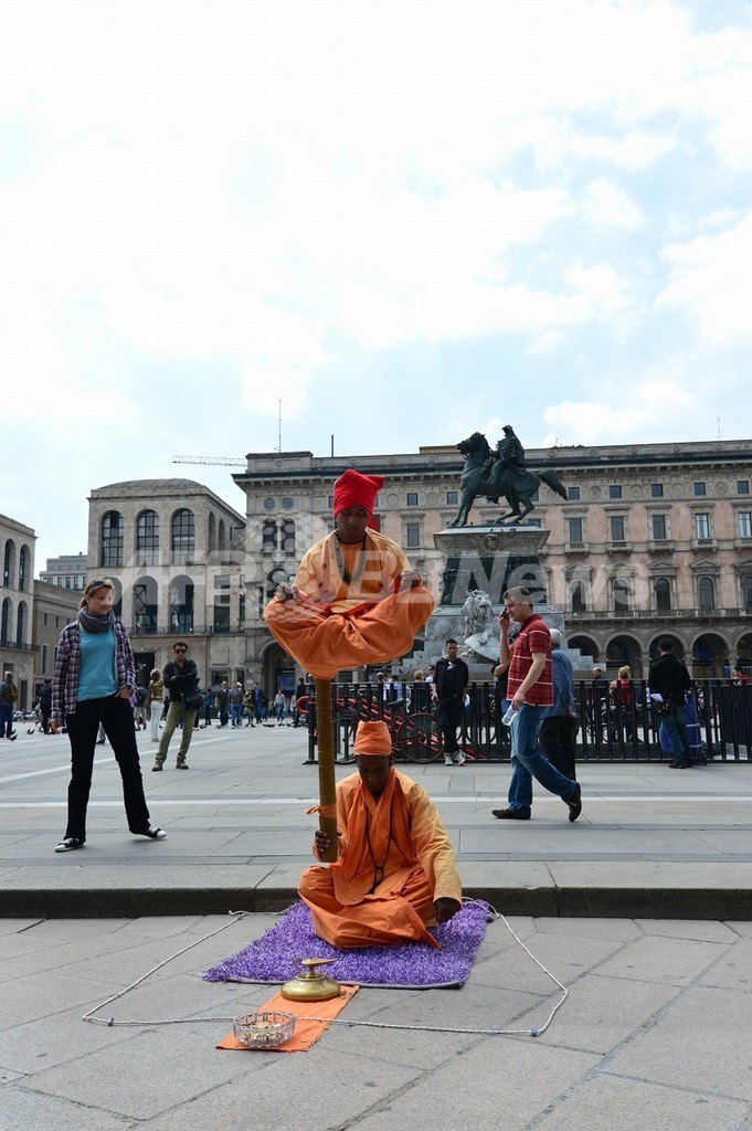 まるで空中浮遊、ミラノ大聖堂前の大道芸人