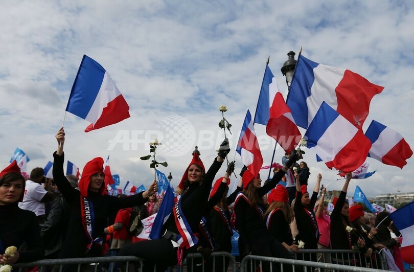 写真は、フランス国旗とバラを手にデモに参加した同性婚反対派の人々(2013年5月26日撮影)。(c)AFP/THOMAS SAMSON