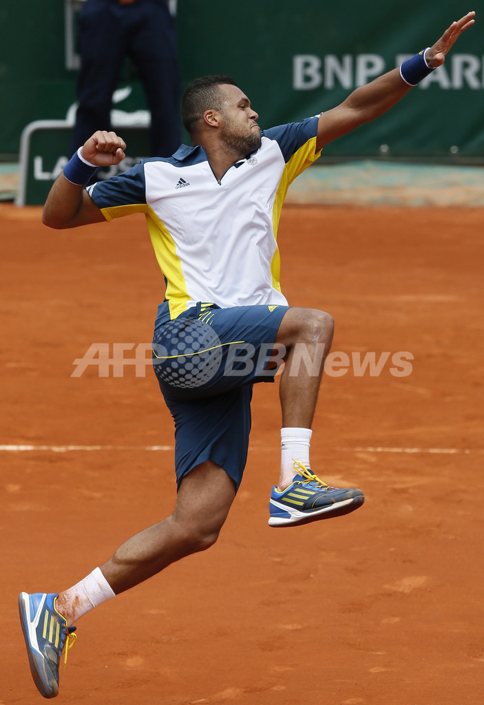 試合に勝利し歓喜するジョーウィルフリード・ツォンガ(2013年5月27日撮影)。(c)AFP/PATRICK KOVARIK