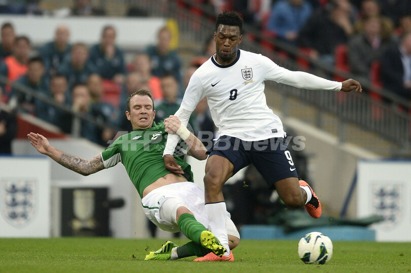 アイルランドのグレン・ウィーラン(Glenn Whelan、左)のタックルを受けるイングランドのダニエル・スターリッジ(Daniel Sturridge、2013年5月29日撮影)。(c)AFP/ADRIAN DENNIS