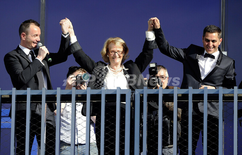 写真は、式を終えたオータンさん(左)とボアローさん(右)。中央はエレーヌ・マンドロー(Helene Mandroux )モンペリエ市長(2013年5月29日撮影)。(c)AFP/PASCAL GUYOT