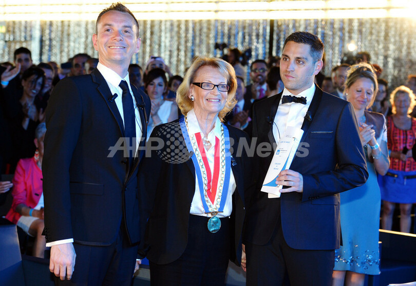 写真は、式で同市のエレーヌ・マンドロー(Helene Mandroux)市長(中央)と並ぶオータンさん(左)とボアローさん(右、2013年5月29日撮影)。(c)AFP/GERARD JULIEN