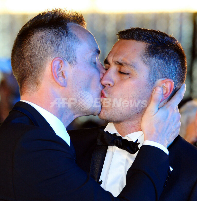写真は、式でキスを交わすオータンさん(左)とボアローさん(2013年5月29日撮影)。(c)AFP/GERARD JULIEN