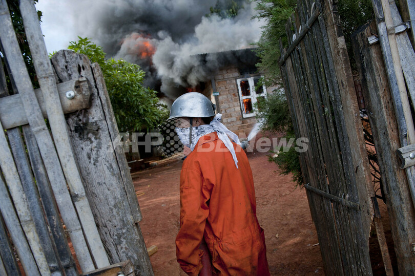 写真はラショ―で、放火された建物の消火にあたる消防士(2013年5月29日撮影)。(c)AFP/YE AUNG THU