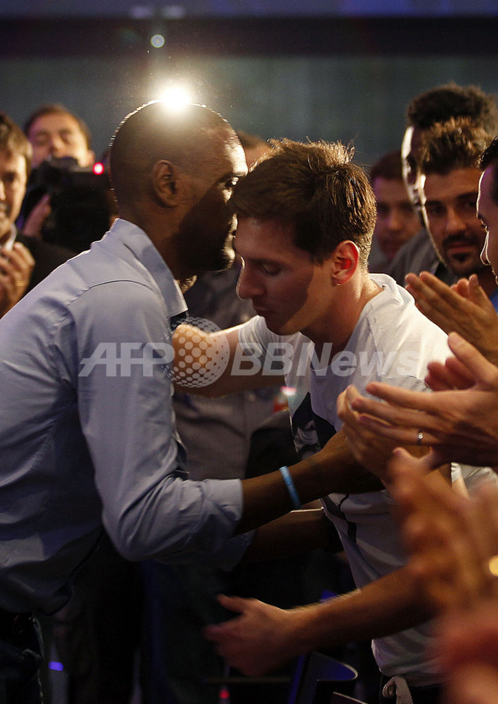 記者会見終了後にエリック・アビダル(左)と抱擁を交わすリオネル・メッシ(Lionel Messi、2013年5月30日撮影)。(c)AFP/QUIQUE GARCIA