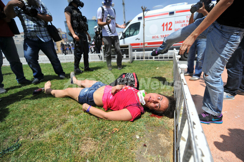 写真は、衝突で負傷し、地面に横たわる女性(2013年5月31日撮影)。(c)AFP/OZAN KOSE