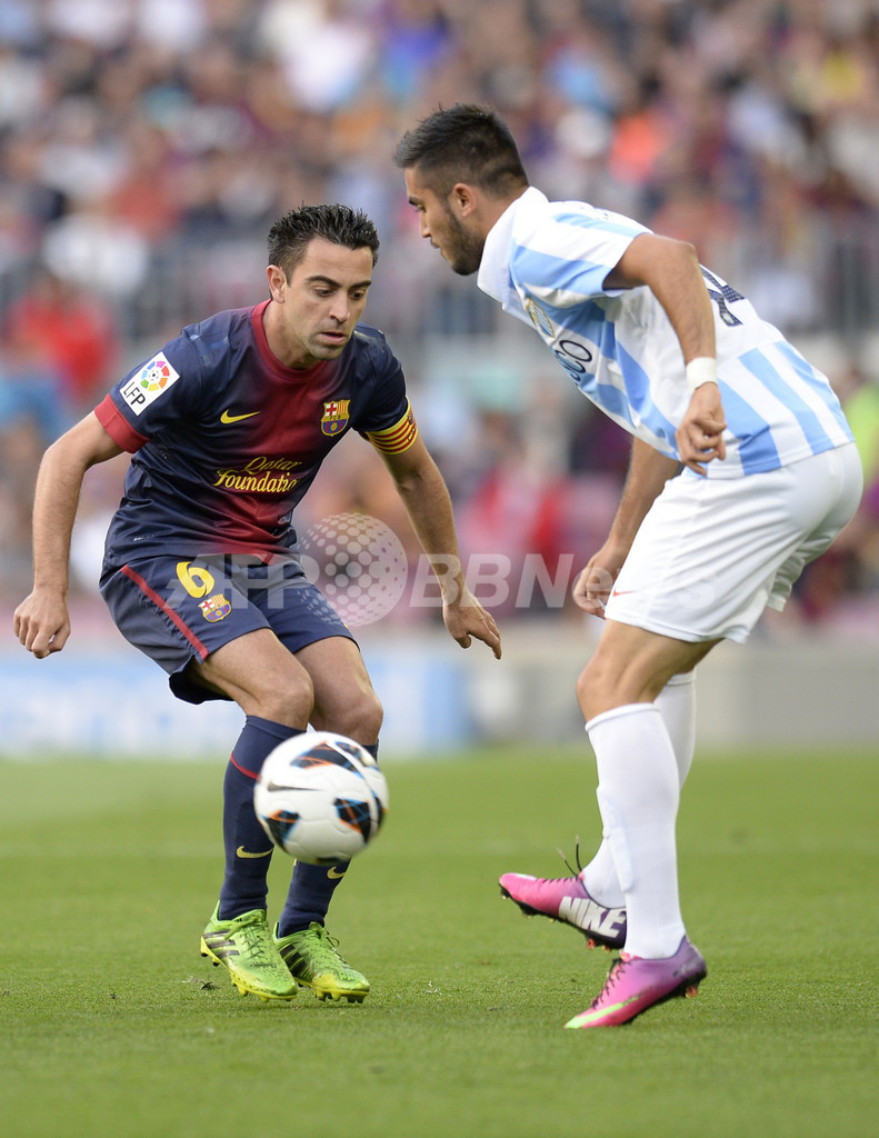 マラガのペドロ・モラレス(Pedro Morales、右)とボールを競るFCバルセロナのシャビ・エルナンデス(Xavi Hernandez、2013年6月1日撮影)。(c)AFP/LLUIS GENE