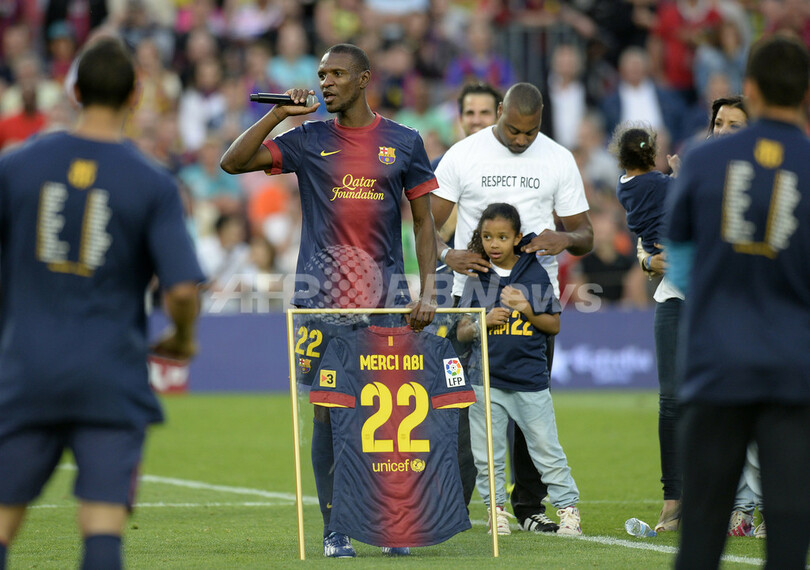 試合後のセレモニーで「ありがとうアビ、22」と書かれた記念のユニホームを手に、スピーチをするFCバルセロナのエリック・アビダル(Eric Abidal、2013年6月1日撮影)。(c)AFP/LLUIS GENE