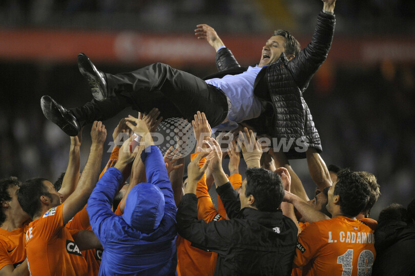試合後、胴上げされるレアル・ソシエダのフィリップ・モンタニエル(Philippe Montanier)監督(2013年6月1日撮影)。(c)AFP/MIGUEL RIOPA